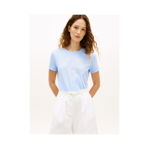 Tommy Hilfiger women's T-shirt. Made from soft, stretchy cotton jersey, our lighthouse logo tee is a comfortable layer with maritime spirit. Wear it while running errands, relaxing at home or on weekend coastal adventures.