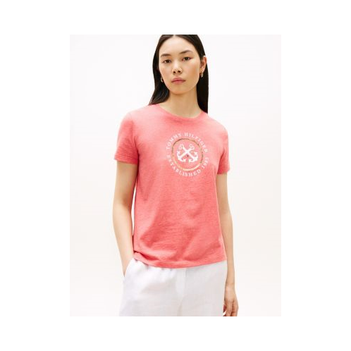 Tommy Hilfiger women's T-shirt. Made from soft, stretchy cotton jersey, our TH anchor logo tee is a comfortable layer with maritime spirit. Wear yours for downtime, running errands or an offshore adventure.