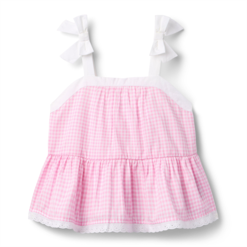 Check all the boxes for sunny day style with our gingham top. Featuring a peplum silhouette, bow straps and eyelet trim.