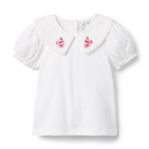 It's the little details that make this soft cotton jersey top extra specialfrom the embroidered florals to the crochet trim collar and the puff sleeves too.