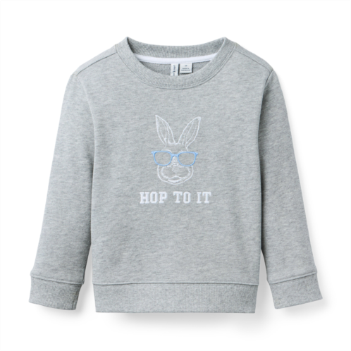 A cozy favorite in soft French terry. Featuring an embroidered Hop To It bunny graphic and ribbed details too.