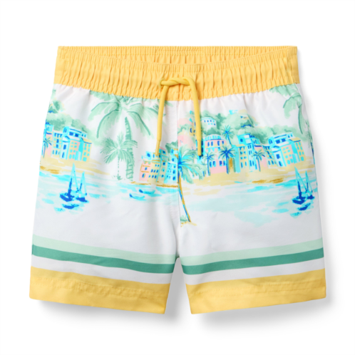 It's a vacation vibe with our swim trunk featuring an tropical island print. With UPF 50+ sun protection, a touch-close back pocket and embroidered eyelets to let water drain out. Responsibly made with recycled fabric.