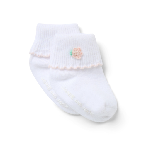 An embroidered flower detail makes this foldover sock a must-have for spring. Finished with a scalloped edge.