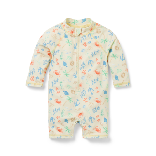 For first splashes, our sea friends rash guard swimsuit has baby covered. We love its raglan sleeves, effortless zip front and UPF 50+ sun protection. Responsibly made with recycled polyester fabric.