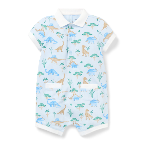 Our romper in pure cotton pique features allover dinosaur friends, a polo collar and contrast ribbed trim. With little pockets too, just because.