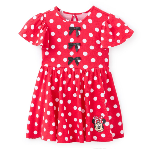 Just like Minnie, social superstars will always be party-ready when slipping into this crinkle knit dress printed in Minnie's signature polka dots. Contrast satin bows decorate the bodice front with button top keyhole closure on back and free-flowing puffed sleeves. Everyone will want to say 'Yoo Hoo' to the new you. Smile and enjoy the spotlight!