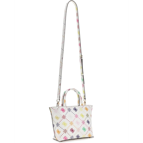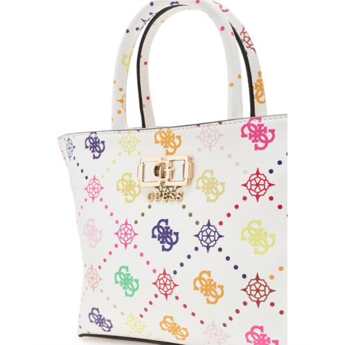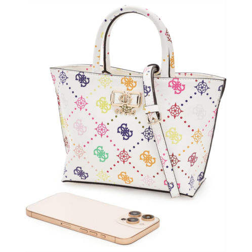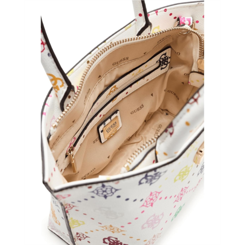 - The hallmark of effortless cool, GUESS Emelie Logo Mini Tote. Crafted from sleek PU material with a smooth polyester lining, this compact tote delivers a luxe look without the fuss. The eco 4G peony logo print adds that instantly recognizable GUESS appeal, while shiny gold hardware elevates the design with a polished finish. Designed with one main compartment and an interior zipper pocket, it keeps your essentials neatly organized and easy to reach. The secure zipper closure ensures everything stays in place, whether you're brunch-hopping or heading out for errands. Carry it your way with the structured top handle for a classic tote moment, or switch things up using the detachable crossbody strap for hands-free styling on the go.