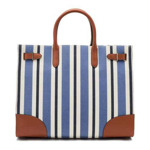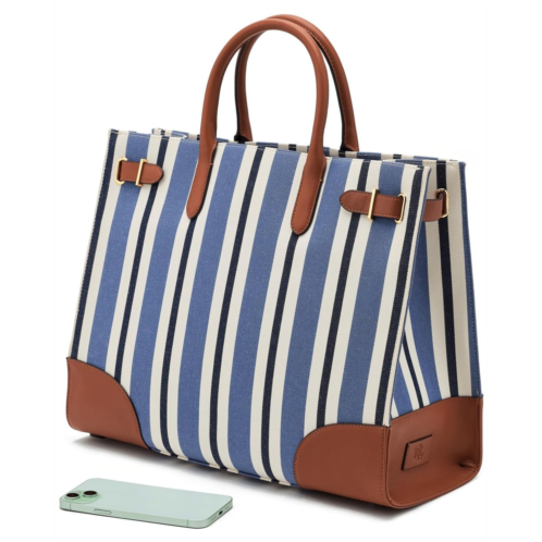 - Slender, yarn-dyed stripes bring timeless appeal to this version of the large canvas Devyn tote bag by LAUREN Ralph Lauren, while its spacious silhouette and myriad of pockets offer ample storage for your essentials. It's trimmed with supple full-grain leather, which is distinguished by its naturally smooth finish for a luxurious touch. Designed for both style and practicality, it features two sturdy top handles and a magnetic snapped closure to keep your belongings secure. The interior includes a zip pocket and two slip pockets for easy organization, and the size is generous enough to fit a laptop, tablet, and other daily tech essentials with ease.