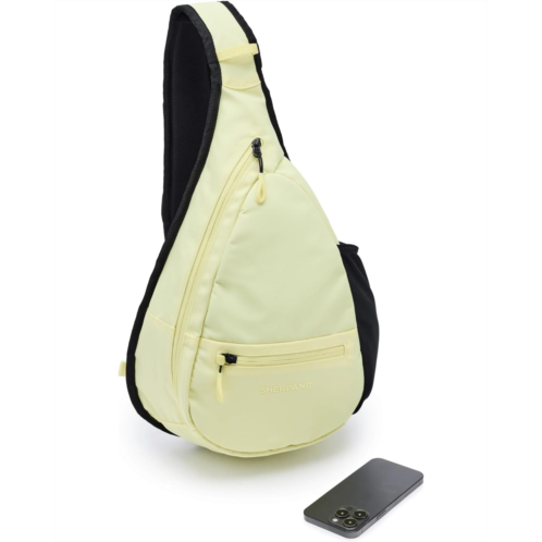 - Keep your essentials safely stored in the Sherpani Esprit Sling Pack. Cell phone pocket on the shoulder strap allows for quick access. Small water bottle holder is added for outdoor adventures and long travel days. The zippered closure with spacious interior and interior zippered pocket, along with a zippered mesh pocket stores smaller essentials, while the adjustable and padded sling backpack strap allows easy carrying. The durable, water-resistant exterior is made from recycled polyester fabric and the bag comes with a RFID-protected lining.