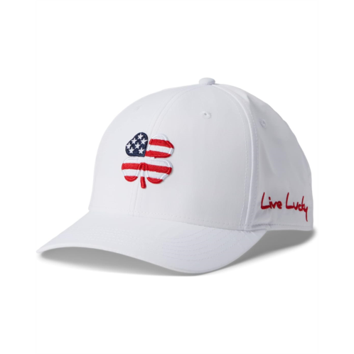 - 3D embroidered clover with USA flag design on the front, 'Live Lucky' branding on the side.