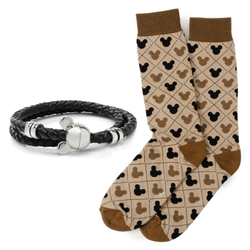 Our Mickey Mouse Icon Sock and Bracelet Gift Set is a whimsical and stylish addition to any wardrobe. The black double wrapped leather bracelet features a silvertone metal Mickey icon magnetic clasp. An allover diamond pattern on the coordinating socks features black and tan Mickey icons. It's a perfect gift for the Disney fan in your life.