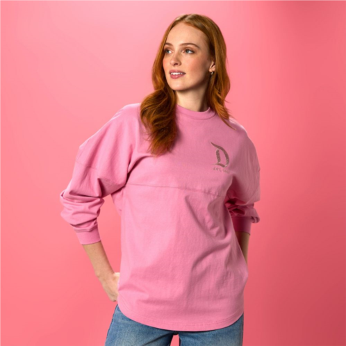 Take home a style-conscious souvenir of The Happiest Place on Earth with this pink pullover Spirit Jersey featuring embroidered rose gold gothic ''D'' icon on chest. On back shoulder, the Disneyland logo is spelled out in faux pearl and rose gold beading with rose gold embroidery. You'll be tickled pink!