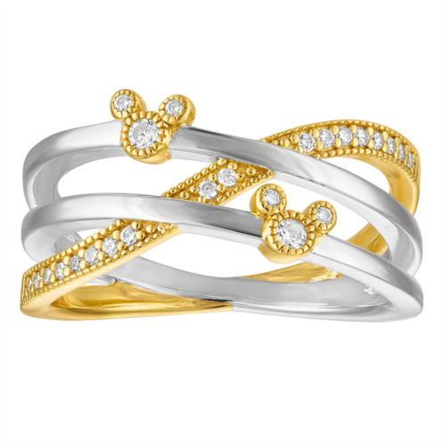 Bands of sterling silver and 18k yellow gold delicately overlap in the crisscross design of this elegant Rebecca Hook ring. The sterling silver bands are detailed with Mickey icons of sparkling cubic zirconia and finished in 18k yellow gold. The gold band is encrusted with clear cubic zirconia, creating a piece dazzling with sophisticated charm and character.