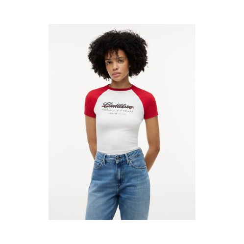 Tommy Hilfiger women's T-shirt. Our raglan-sleeve tee is made from stretch-cotton jersey with a smooth feel and is cut in a slim fit. Celebrating optimism and craftsmanship, discover a collection blending classic American cool with modern race-inspired details and the Cadillac F1 Team’s precision.
