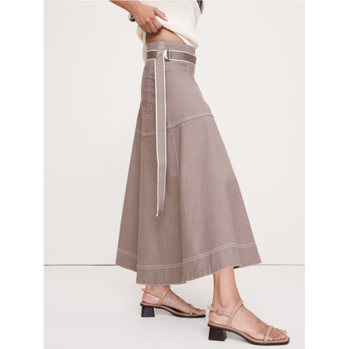 - An exploration of luxe utility,we added a removable belt at the waist, decorative top stitching, and an extra-wide hem to emphasize the A-line shape of this long skirt. Cut from rugged, yet soft stretch-cotton canvas and garment dyed for already-loved softness.