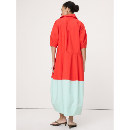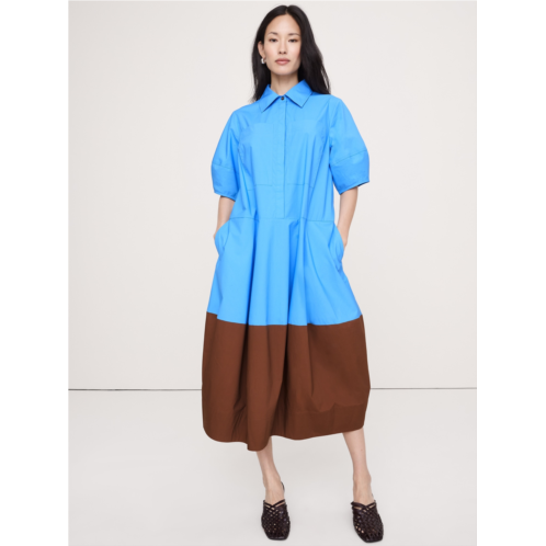 - A barrel-shaped twist on the classic shirt dress, we added a color-blocked effect at the skirt as well for an extra dose of optimism. Cut from our signature 100% cotton poplin so it's ideal in all seasons.