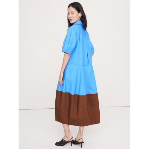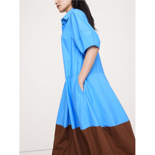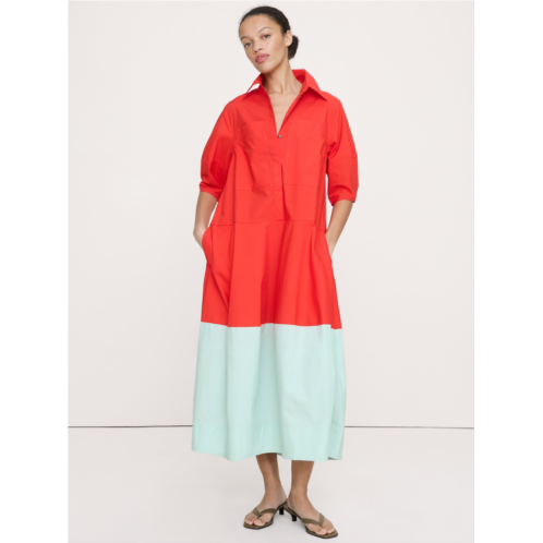 - A barrel-shaped twist on the classic shirt dress, we added a color-blocked effect at the skirt as well for an extra dose of optimism. Cut from our signature 100% cotton poplin so it's ideal in all seasons.