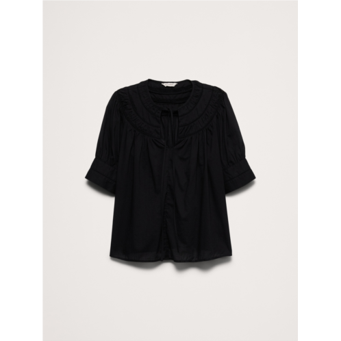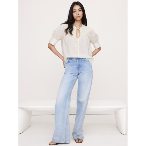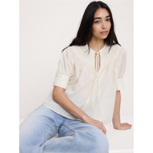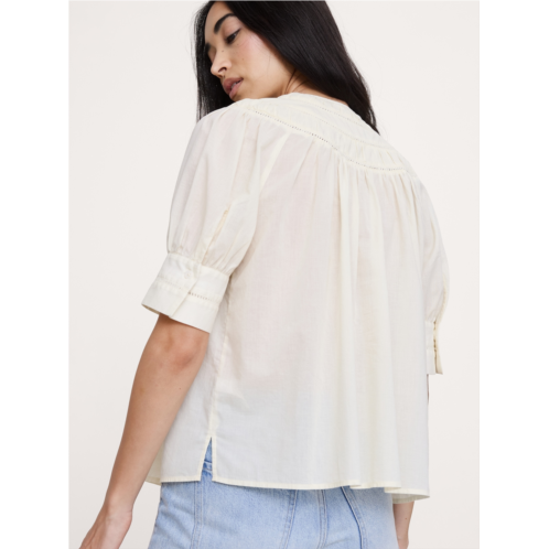 - Our nod to heirloom embroidery techniques, this semi-sheer cotton top has femme puffed sleeves and a split neck design, with delicate inset lace details at the collar and cuffs.