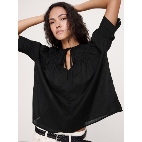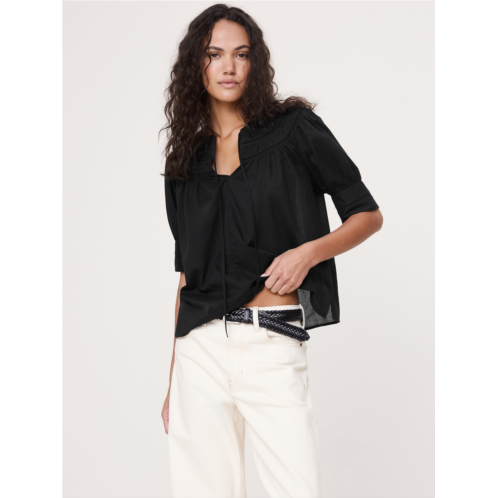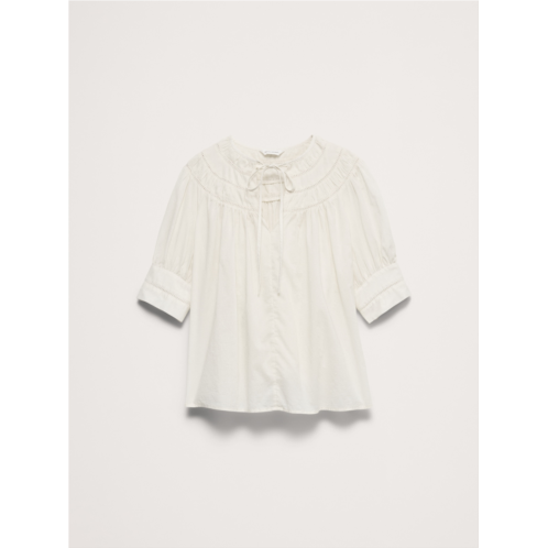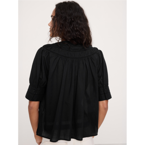 - Our nod to heirloom embroidery techniques, this semi-sheer cotton top has femme puffed sleeves and a split neck design, with delicate inset lace details at the collar and cuffs.