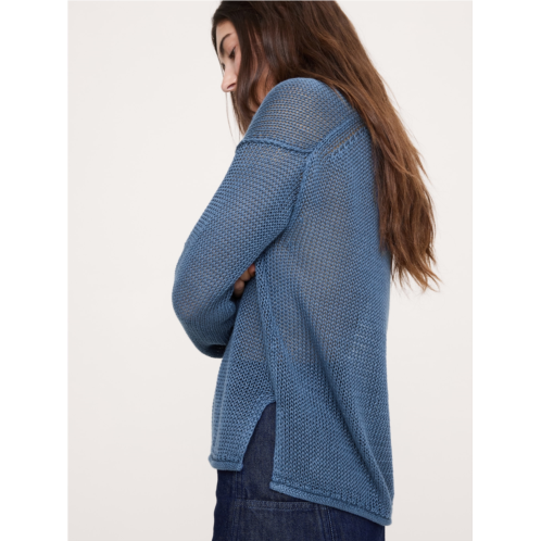- We're living in 100% linen. Enter, this long-sleeve sweater: it has a slouchy fit and textured seams. Plus, we knit it in our signature, chunky linen yarn using a stitch that gives it beautiful drape and semi-sheer look.