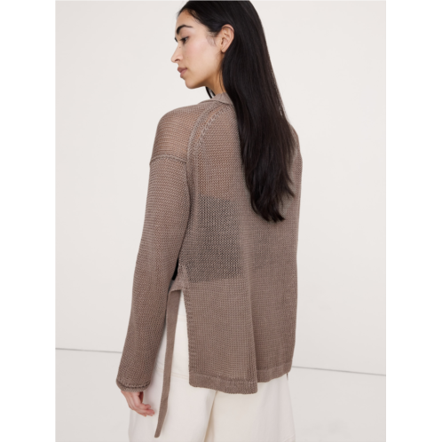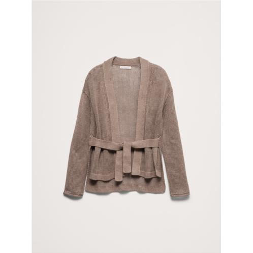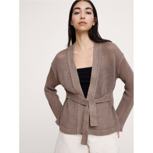 - We're living in 100% linen. Enter, this cardigan sweater. It has an easy fit and ties at the sides so you can style it open and tied at the back, or wrap it closed. Plus, we knit it in our signature linen yarn using a stitch that gives it a beautiful drape.