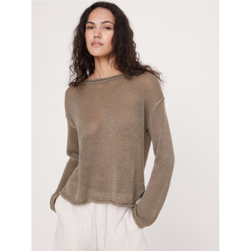 - We're living in 100% linen. Enter, this boatneck sweater: it has a slouchy fit and textured seams. Plus, we knit it in our signature, chunky linen yarn using a stitch that gives it beautiful drape and semi-sheer look.