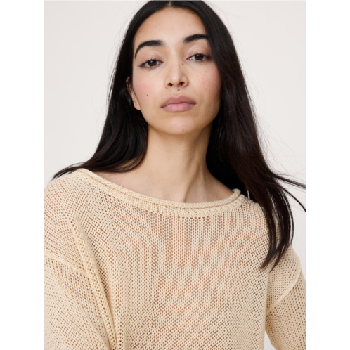 - We're living in 100% linen. Enter, this boatneck sweater: it has a slouchy fit and textured seams. Plus, we knit it in our signature, chunky linen yarn using a stitch that gives it beautiful drape and semi-sheer look.