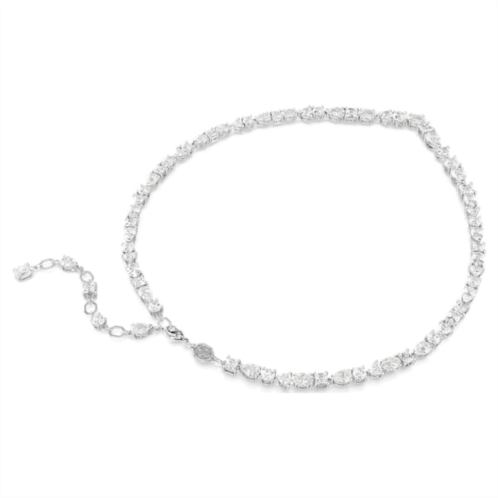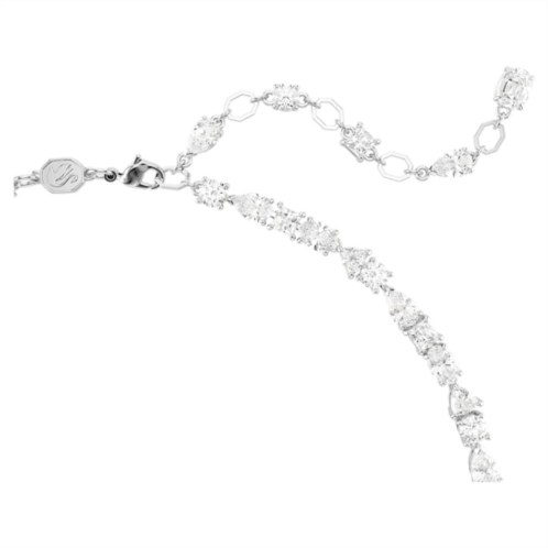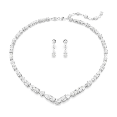 Brand: Swarovski. Mesmera series. SKU: 5674306. Color: White. Swarovski Mesmera Mixed Cuts Set. This set features a necklace crafted with a string of eye-catching Swarovski Zirconia in a rhodium-plated setting, showcasing a striking mix of cuts and sizes. The design is finished with a lobster clasp and a scattering of Swarovski Zirconia for added sparkle. Complementing the necklace, the light-catching earrings are also rhodium plated and feature a bold, dangling design adorned with luminous pear-cut crystals. Material: Rhodium plated, Zirconia. Length: 14 7/8 inches. Clasp type: Fold over clasp.