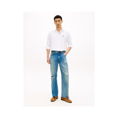 Tommy Hilfiger men's jean. Cut in an easy, loose fit from denim made with lyocell and a touch of stretch, these jeans are smooth and lightweight. Made for casual days and weekends, they feature fading, whiskering and bold distressings for a lived-in look.