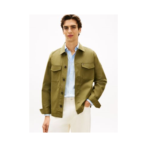 Tommy Hilfiger men's jacket. This shirt jacket is crafted from a durable cotton blend in a rugged twill weave. The easy fit and neutral hue make it a versatile layering piece.