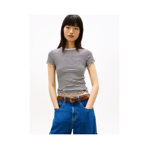 Tommy Hilfiger women's T-shirt. This short-sleeve tee is designed with frilled lettuce trim along its sleeves and hem. Made from stretch rib-knit cotton, it's a soft, comfortable layer. Part of our Tommy Jeans collection.