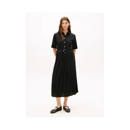 Tommy Hilfiger women's dress. Our mixed-media dress features a jersey bodice and a crepe skirt with sunray-pleated detailing for contrasting texture and movement. Polished gold-tone buttons and a D-ring belt give it an elevated feel.