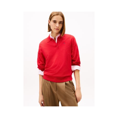 Tommy Hilfiger women's sweater. This sweater polo has a sporty yet elevated aesthetic thanks to the collared button placket and easy fit. The luxurious wool and silk blend has a smooth feel and keeps you warm during the cooler months of the year.