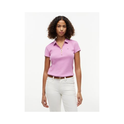 Tommy Hilfiger women's polo. Designed in a trim fit from premium cotton, this short-sleeve polo has an elevated feel, thanks to the gold-tone zip placket.