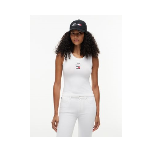 Tommy Hilfiger women's T-shirt. Our logo tank top is made from stretch-cotton jersey with a smooth feel and is cut with a slim fit. Celebrating optimism and craftsmanship, discover a collection blending classic American cool with modern race-inspired details and the Cadillac F1 Team’s precision.