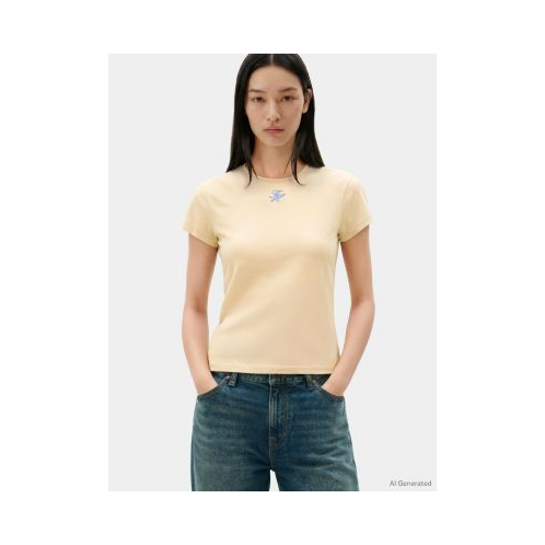 - Short sleeves, crewneck, script monogram at the chest.