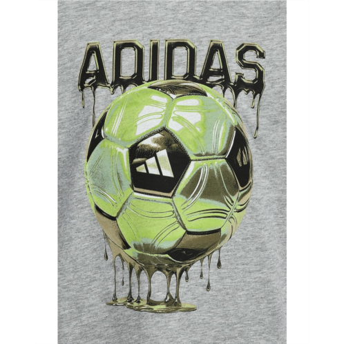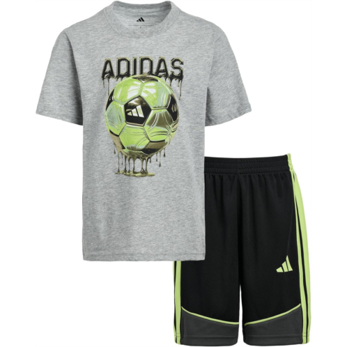 - Get ready for playtime with the dynamic adidas Kids Heather Colorblock Shorts Set. Featuring a pull-on style graphic tee with a soccer ball and chrome drip effect on the chest, it's designed to inspire young athletes. The tee features a crew neck, short sleeves, and a straight hem. The pull-on style shorts offer an elastic waistband for easy wear and bold three-stripes for a sporty look. Made from comfortable materials, this set is perfect for active days at school or on the field.