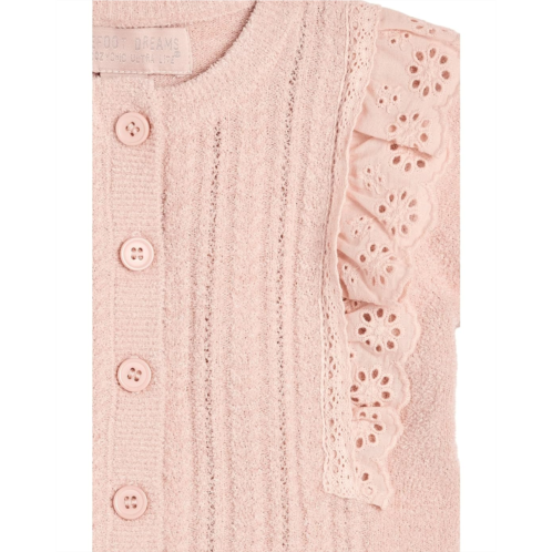 - Dress your little one in timeless charm and comfort with the Barefoot Dreams Kids Cozychic Ultra Lite Baby Set With Cotton Eyelet Ruffle - a beautifully crafted two-piece outfit perfect for any special occasion or everyday elegance. The set includes a short-sleeve cardigan featuring delicate cotton eyelet ruffle detailing along the shoulders and a classic cable knit pattern down the center front. The cardigan's ribbed arm bands, neck band, and waistband provide a snug, comfortable fit that moves with your baby. Its coordinating bloomerkorea bottoms are designed with a soft, stretchy ribbed waistband and cuffs, both finished with subtle ribbing and matching cable knit accents on the front, creating a cohesive and stylish look. The cardigan is styled with short sleeves, a collared neckline, and a straight hem. Delicate and luxurious, this baby set will keep your kid comfortable and cozy all day.