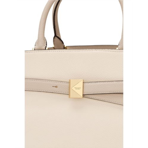 - Architecture for your arm, Kate Spade New York Deco Colorblocked Pebbled Leather Large Satchel. Designed with an angular, structured silhouette, this sculptural beauty instantly elevates any look with modern sophistication. Crafted from richly textured pebbled leather, it delivers both luxe appeal and everyday durability. The open-top design allows easy access to your essentials, while dual interior compartments keep everything beautifully organized. A center zip-pocket divider, along with interior zip and wall pockets, ensures your must-haves stay secure and perfectly in place. Carry it your way with sleek top handles for a refined finish, or attach the removable, adjustable crossbody strap for effortless, hands-free convenience. Signature logo hardware adds that iconic touch of elegance.
