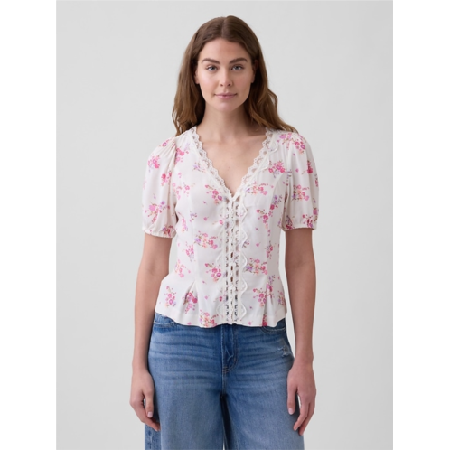 - Lace scalloping at V-neck and button front.