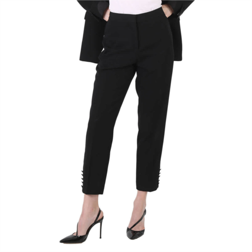 Burberry Ladies Bottoms. SKU - 8024274. Color - Black. Burberry Side Stripe Tailored Trousers. These black wool side stripe tailored trousers feature a concealed front fastening, a cropped length, a stripe detail to the side, two back buttoned welt pockets and side slit pockets. Outer - 100% Wool. Decoration - 100% Silk. Lining - 93% Cupro, 7% Elastane. Made in italy.