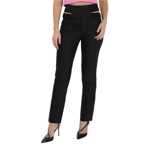 Burberry Ladies Bottoms. Fashion category - Pants & Leggings. SKU - 4564306. Color - Black. Burberry Ladies Black Pinstripe Functional Twill Remodeled Trousers. A functional twill with pinstripes trousers feature a high-waist, cut-out detail knit panels, hook and zipper fastening, and buttoned welt pockets on the rear. Made in Italy.
