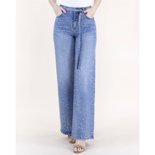 [US] Original USA droplet rhinestone embellished belted high rise wide leg jeans in denim blue