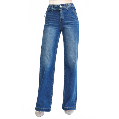 A flattering silhouette that's suprisingly versatile.Step into style with the High Rise Wide Leg Belted Jeans by RISEN in a deep, rich blue, perfect for any dinner party or streetwear ensemble. These jeans, tailored for women, feature a flattering high rise of 10-1/2 inches and a relaxed wide-leg fit with a 33-inch inseam for size 3/26, complete with a practical pocket design. Solid in pattern and featuring a zip closure, they ensure a flowy vibe whether you're at a summer event or out and about. For easy maintenance, simply machine wash and tumble dry.