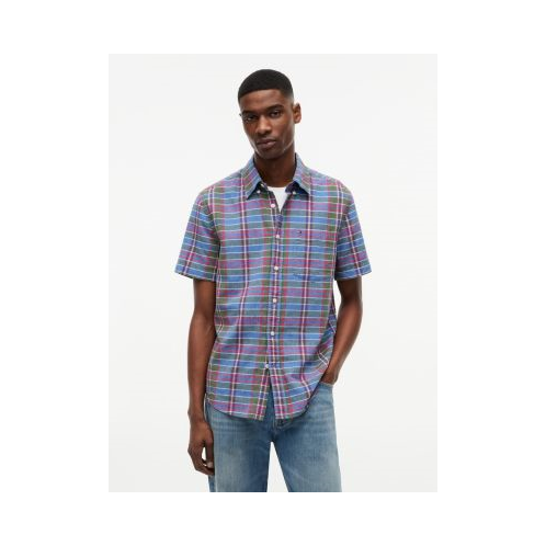 Tommy Hilfiger men's shirt. This short-sleeve shirt is ideal for work and weekends thanks to the versatile plaid print and breezy linen-cotton blend construction.