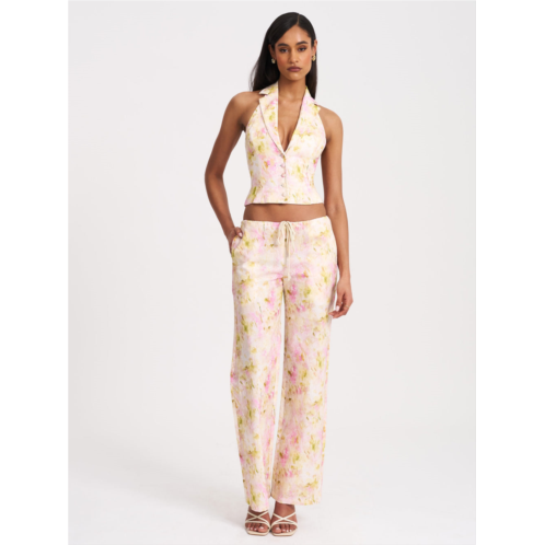 The Laureen Pants are designed for both comfort and style, making them a spring essential for casual outings, vacations, and picnics. Made from breathable linen fabric in a pink floral print, these straight-leg pants offer a relaxed yet polished fit. The drop waist and adjustable lace tie waist ensure a customizable and flattering silhouette. Wear them with the Lauren Vest for a seamless, effortlessly stylish look.