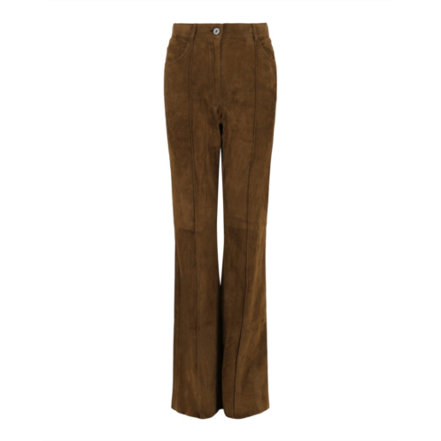 Ferragamo presents these exquisite flared pants crafted from the finest 100% lambskin leather, epitomizing luxury and sophistication. The mid-rise silhouette is complemented by a front button and zip closure, while silver-tone hardware enhances the timeless design. The classic 5-pocket styling adds practicality to their elegant appeal. - Composition - 100% lambskin leather - Care - Specialist clean only - Country of Origin - Made in Italy