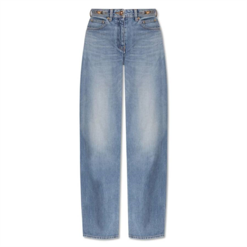 Versace Ladies Bottoms. Fashion category - Jeans & Denim. SKU - 1019945-1A14295-MEDIUM BLUE. Color - Medium Blue. Versace Regular-Fit Cotton Denim Jeans. These medium-wash jeans are crafted from premium Japanese cotton denim, celebrated for its distinctive fade and long-lasting durability. Featuring a regular fit, they are accented with Medusa '95 hardware on the sides, a Versace logo patch, and finished with a front button and zipper closure and a classic five-pocket design. 100% Cotton.