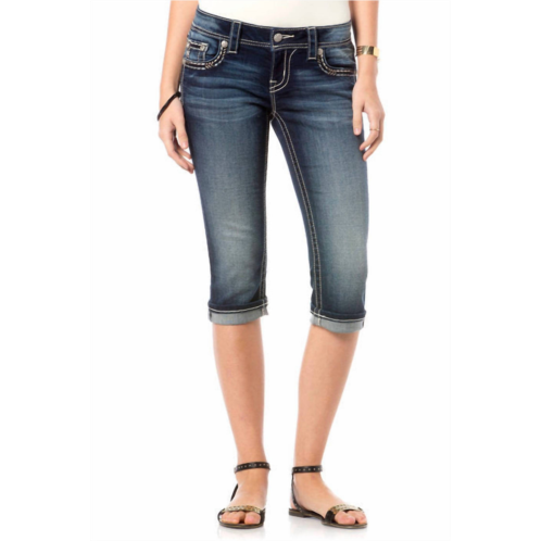 The perfect casually cool capri pant.Elevate your casual ensemble with the Weekender Capri by Miss Me, perfect for any weekend activity. Crafted from a cotton blend, this women's capri features a dark wash with decorative contrast stitching, cuffed hems, and silver logo hardware. These capris boast a 7.5' front rise and a 20' inseam with cuff, completed with a convenient zip closure. Care is simple with machine wash separately in cold water and tumble dry instructions.