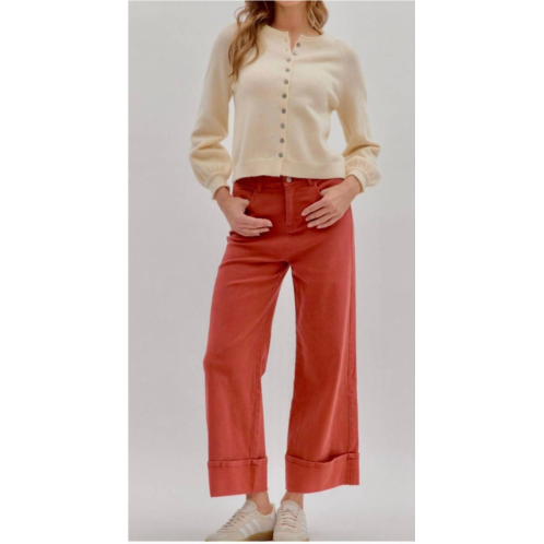 Introducing the Wide Leg Pants by Entro in a rich rust hue, perfect for elevating your casual wardrobe with laid-back sophistication. These solid, mid-rise ankle length pants feature a relaxed fit with stylish cuffed hems, tailored from a lightweight 97% cotton and 3% spandex blend. Designed with classic jean pockets and a secure zip-fly button closure, they're perfect for versatile styling during travel or spring outings. Available in sizes S (0-2-4), M (6-8), and L (10-12).